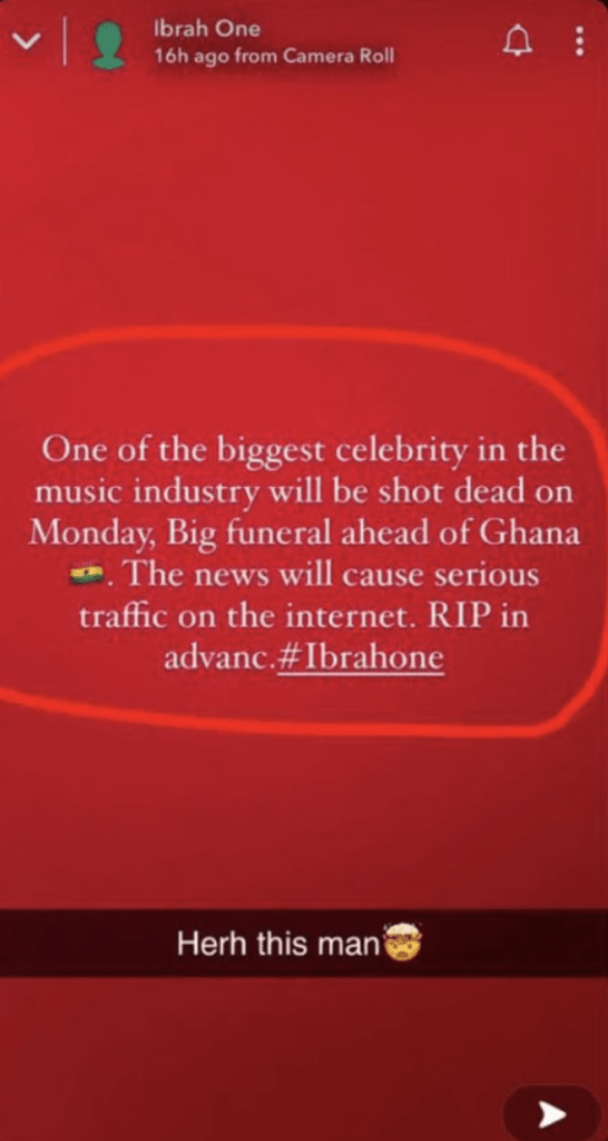 “One of the biggest celebrity in the music industry will be shot dead on Monday. Big funeral ahead of Ghana. The news will cause serious traffic on the internet. RIP in advance. #Ibrahone”