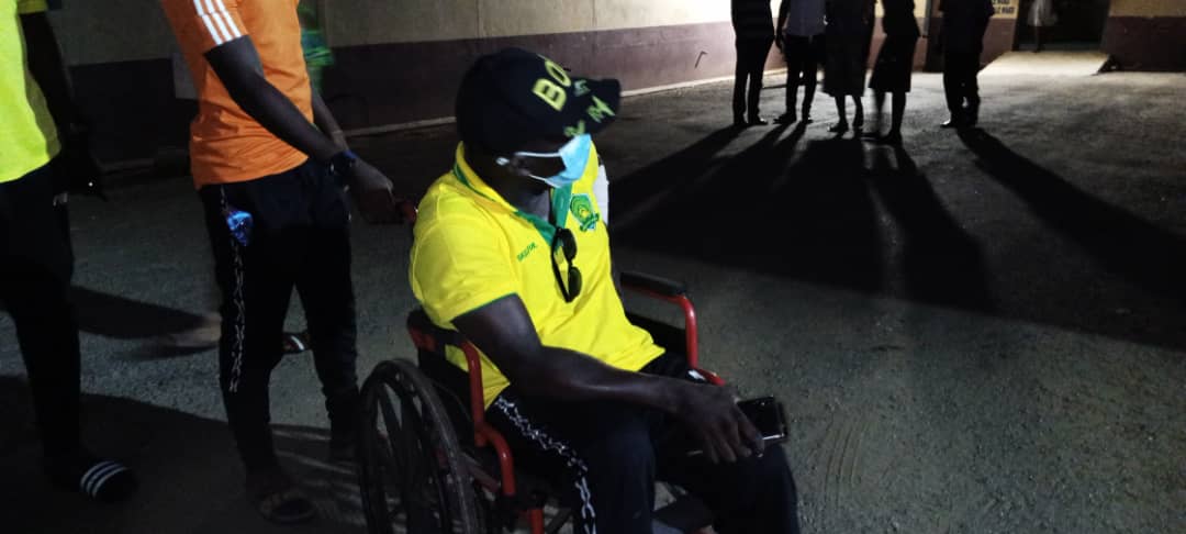 The gaffer was captured in a wheelchair after he was beaten by supporters of the home team for allegedly carrying black magic “juju”.