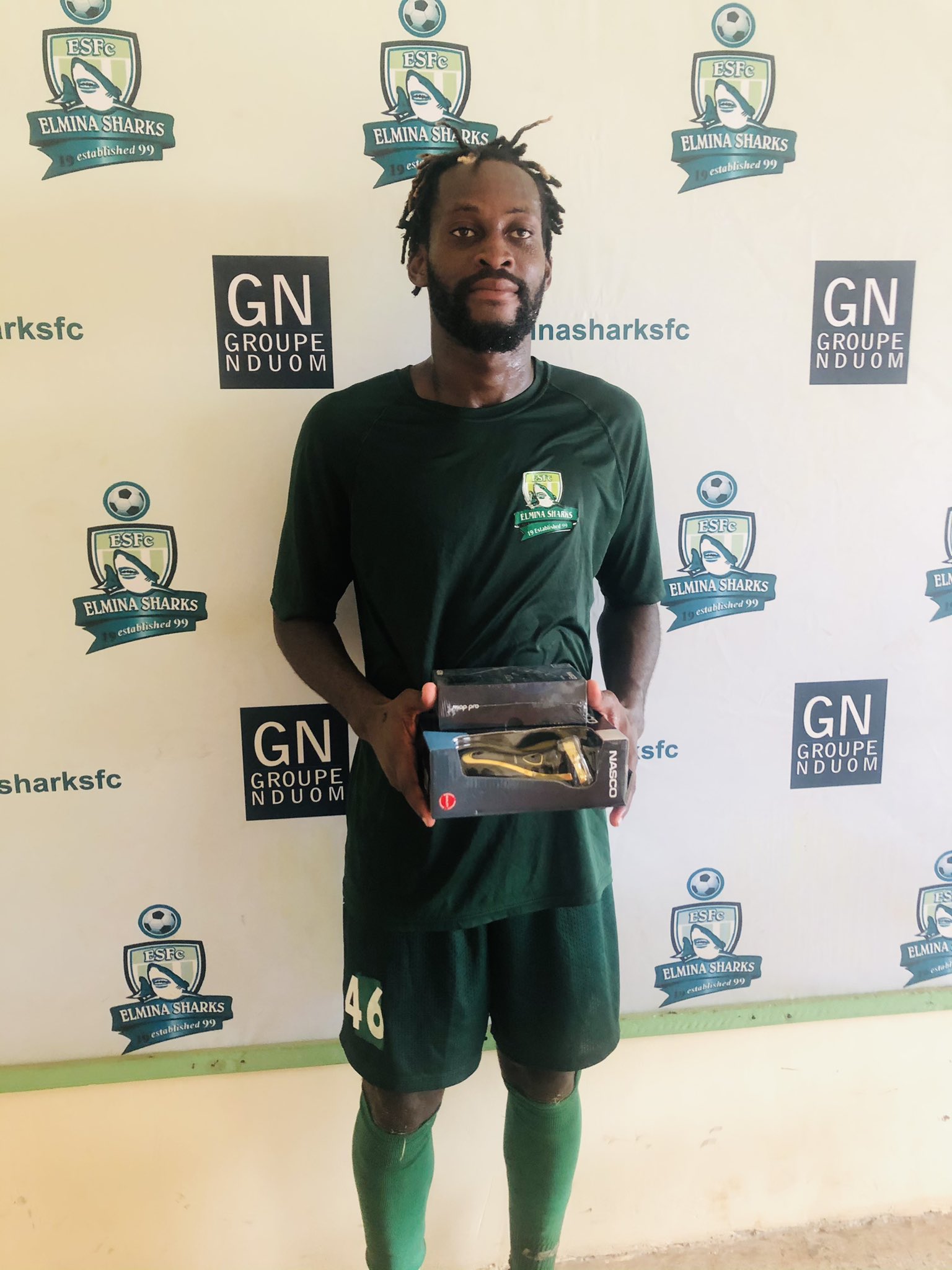 Elmina Sharks FC defender Geoffrey Edwin Acheampong was named man of the match award in the fearsome sharks come from behind victory of the Miners on Sunday.